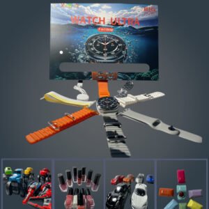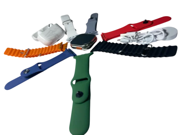 1 Smartwatch Unit – Large rectangular screen with rounded edges, side crown button, and a rugged metallic look, mimicking the Apple Watch Ultra design.